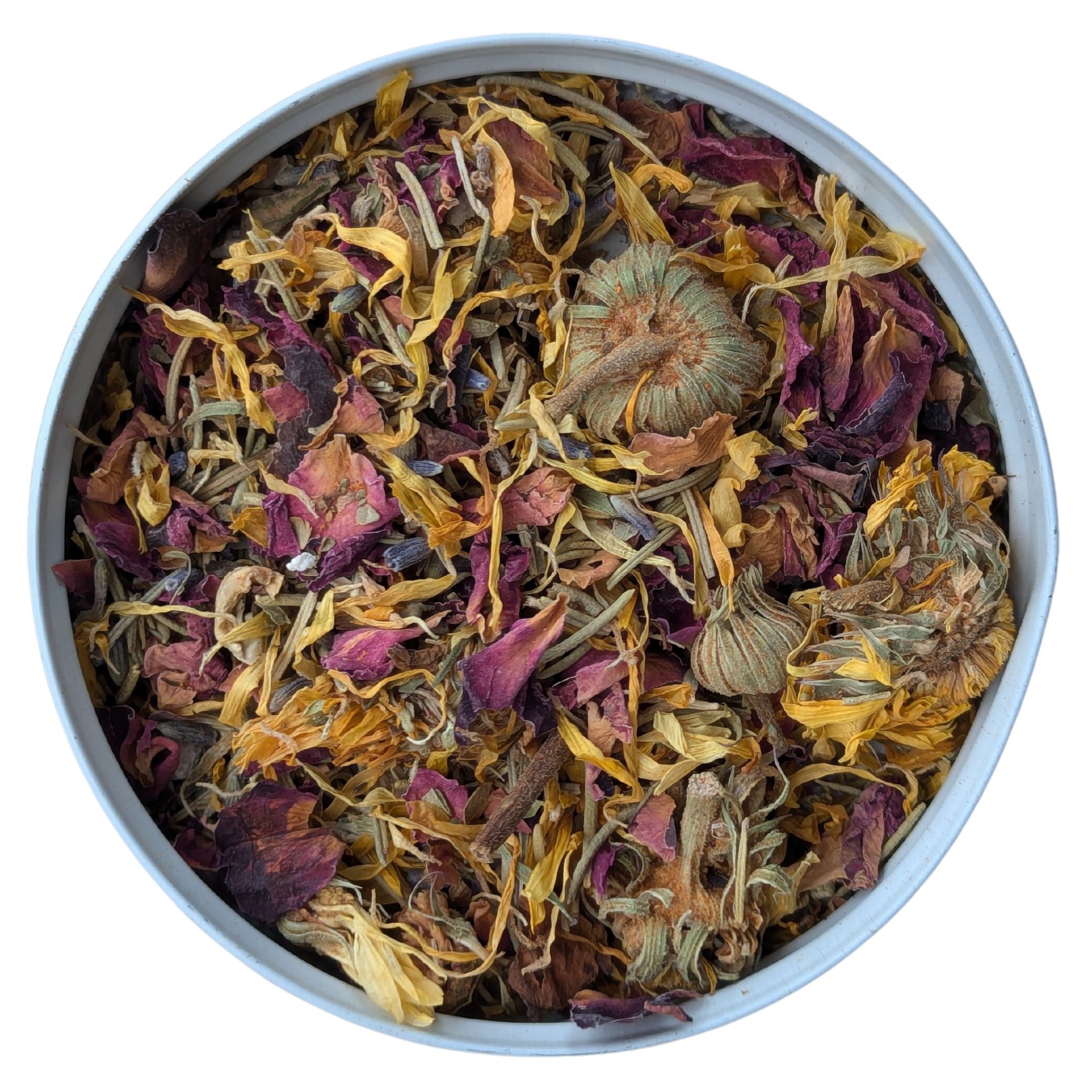 Calendula flowers, rose petals, basil, paprika, oregano, rosemary, chamomile, lavender, calcium carbonate.