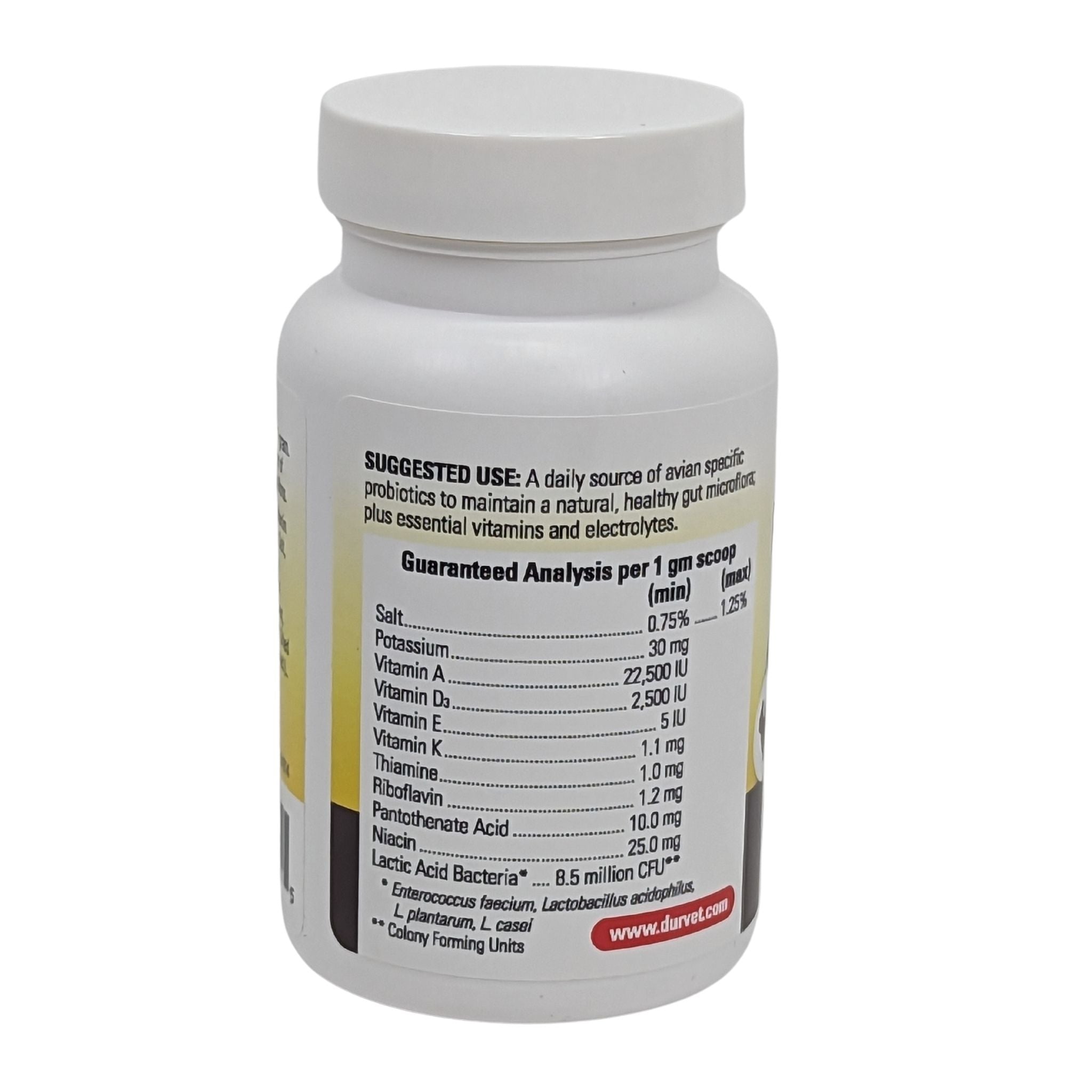 Dextrose, potassium chloride, Vitamin A acetate, niacinamide, d-calcium pantothenate, salt, Vitamin E, silicon dioxide, Vitamin D3, Vitamin K (menadione sodium bisulfite complex), riboflavin, dried Enterococcus faecium, dried Lactobacillus acidophilus, dried L. plantarum, dried L. casei, thiamine HCl.