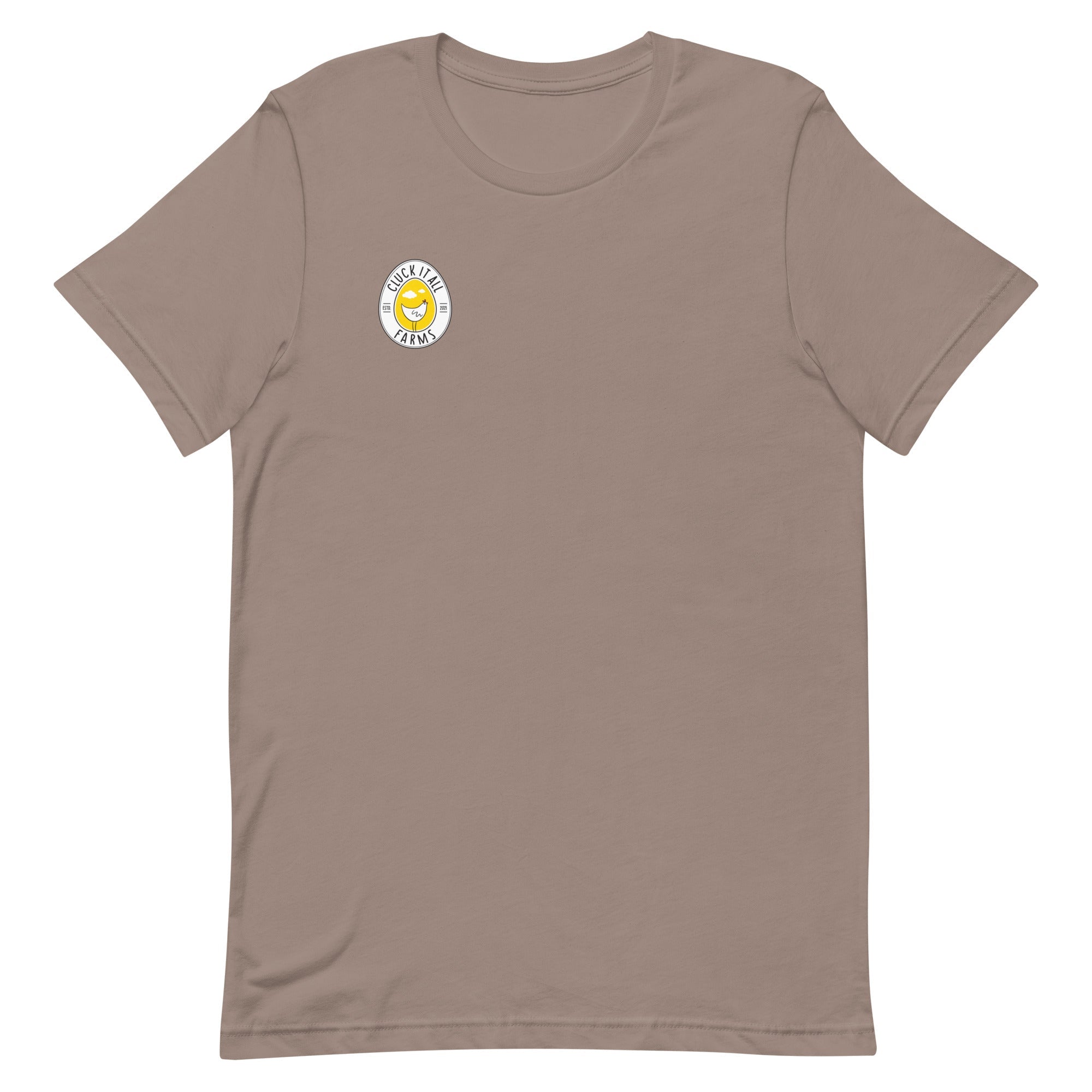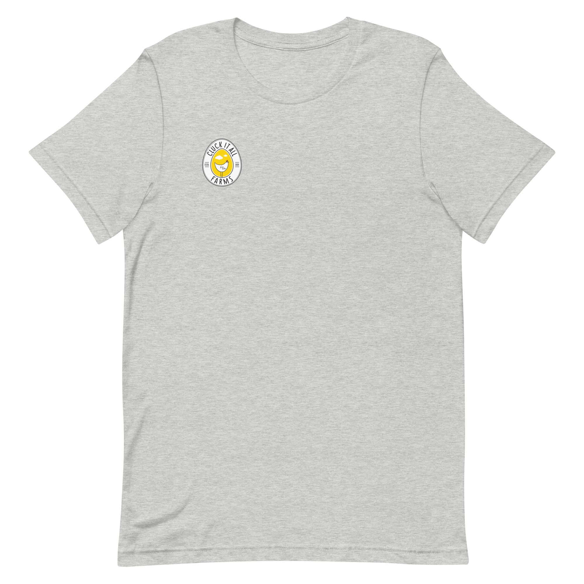 Print placement: back print design; Cluck It All Farms logo on the front